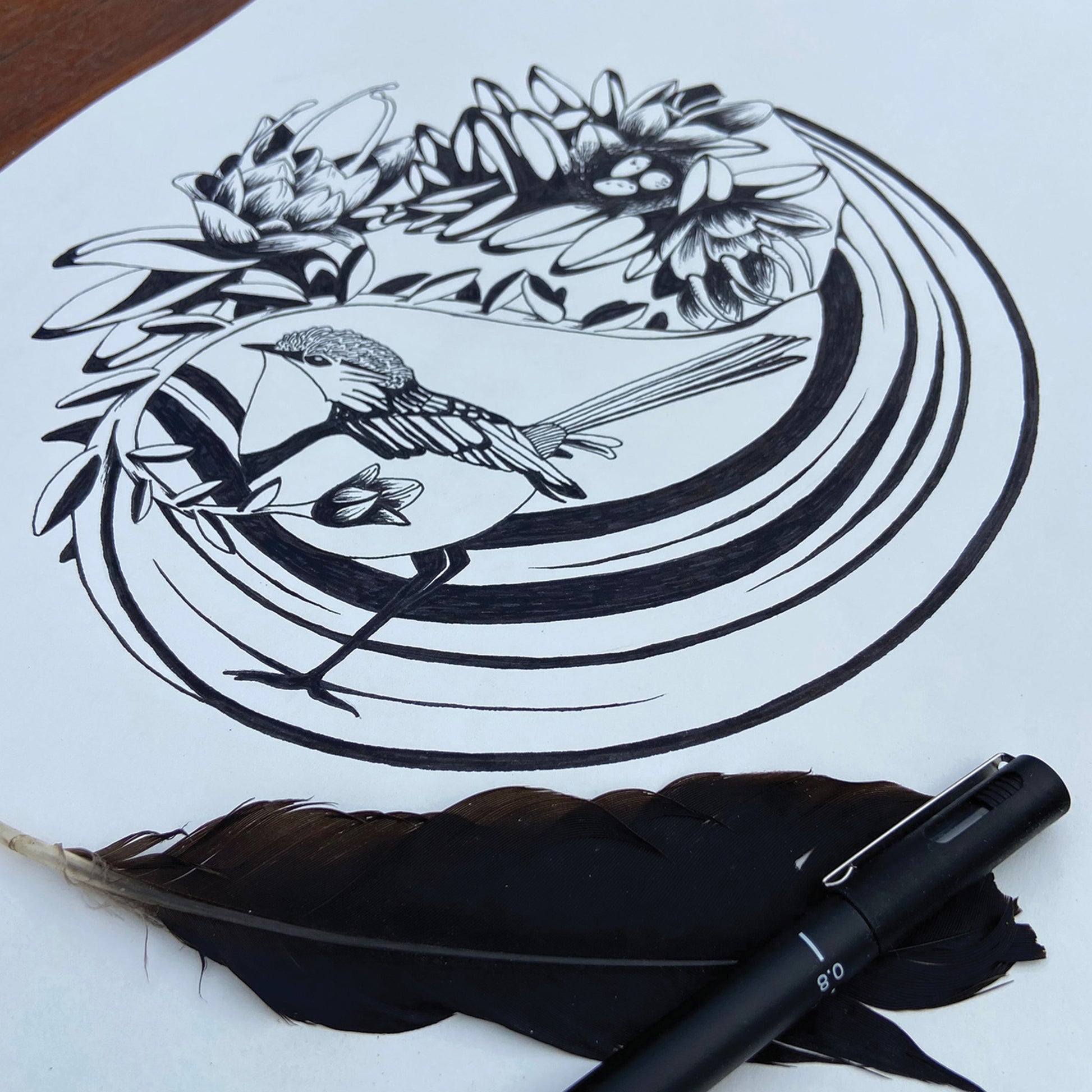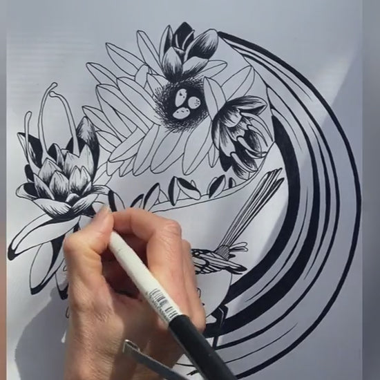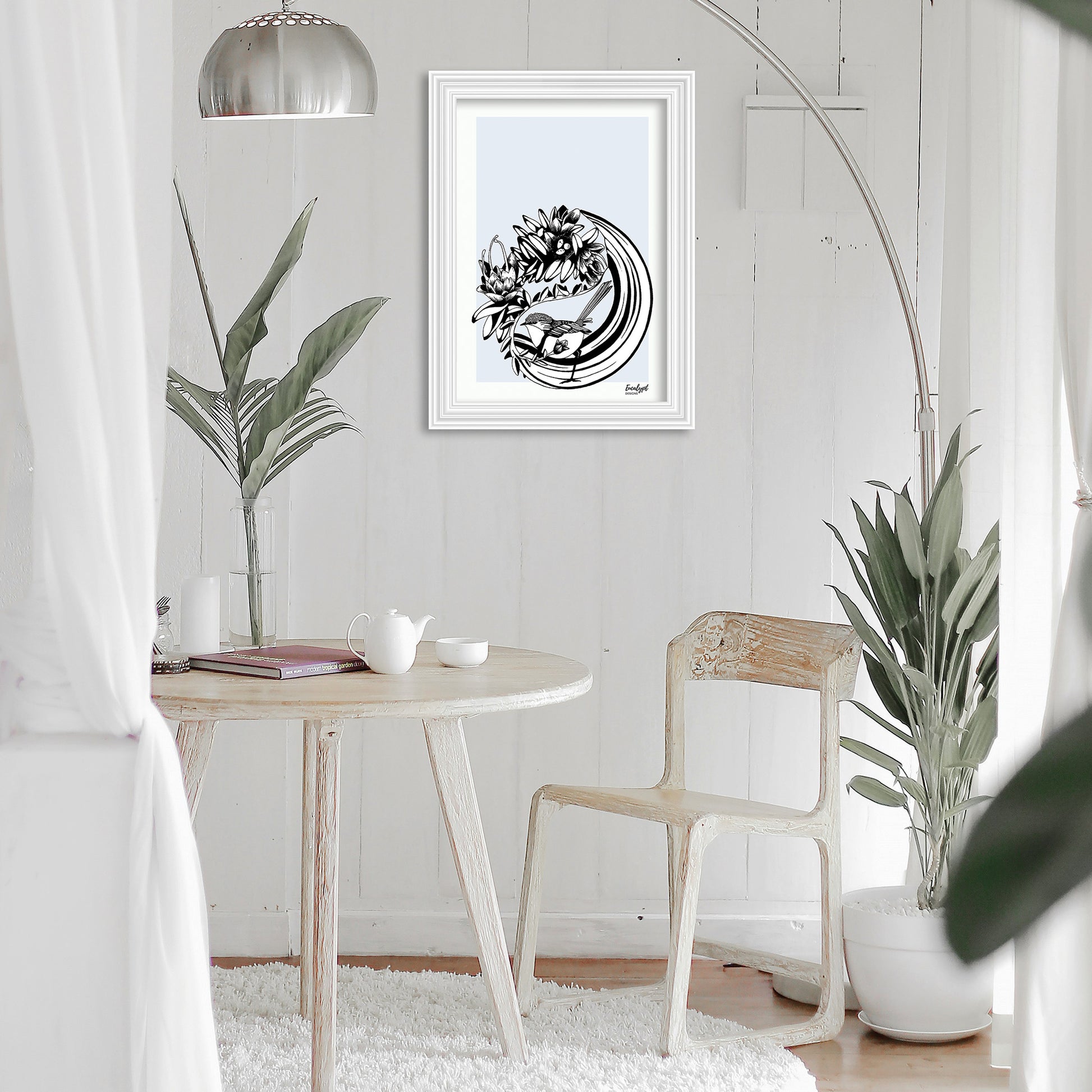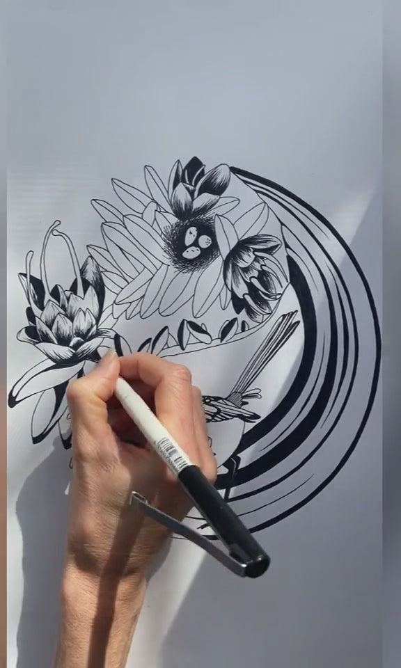 This Australian-made fine art print features the vibrant Splendid Fairy-wren, delicately perched among the soft, flowering forms of the native Darwinia plant — one of its common nesting habitats. Hand drawn with intricate ink work, the piece captures the way Australia's fauna lives in harmony with its flora.